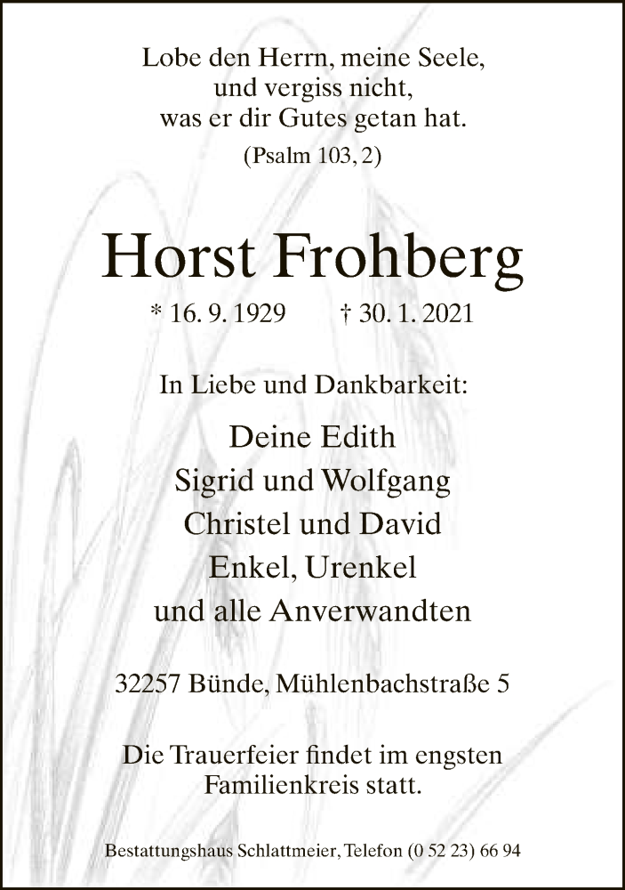 Hier finden Sie alle Traueranzeigen aus der Zeitung, die bisher für Horst Frohberg erschienen sind. Weitere Traueranzeigen, die in der Zeitung erscheinen, werden hier ebenfalls aufgelistet