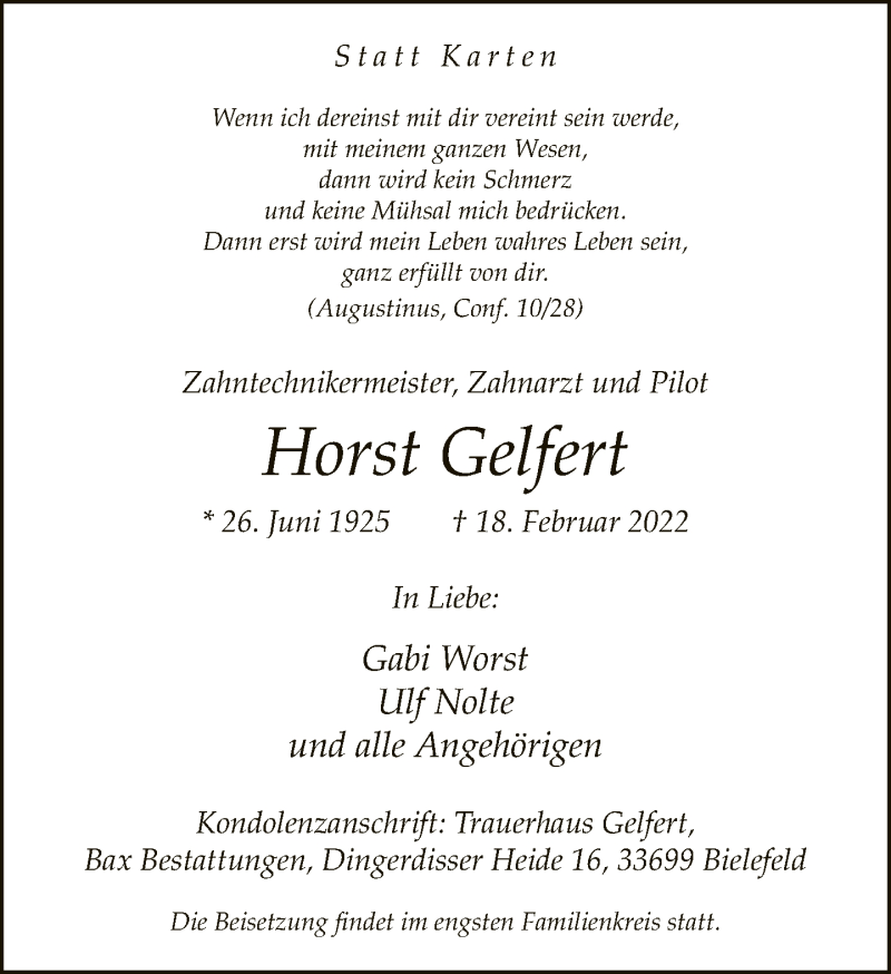 Hier finden Sie alle Traueranzeigen aus der Zeitung, die bisher für Horst Gelfert erschienen sind. Weitere Traueranzeigen, die in der Zeitung erscheinen, werden hier ebenfalls aufgelistet