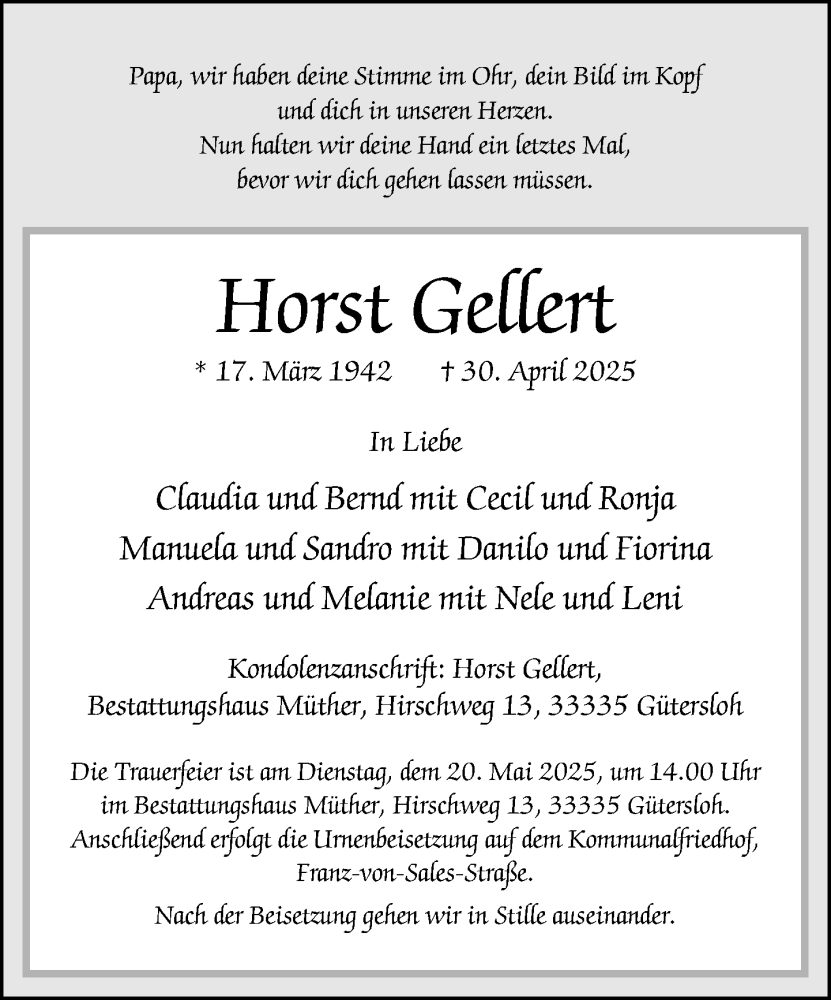 Hier finden Sie alle Traueranzeigen aus der Zeitung, die bisher für Horst Gellert erschienen sind. Weitere Traueranzeigen, die in der Zeitung erscheinen, werden hier ebenfalls aufgelistet