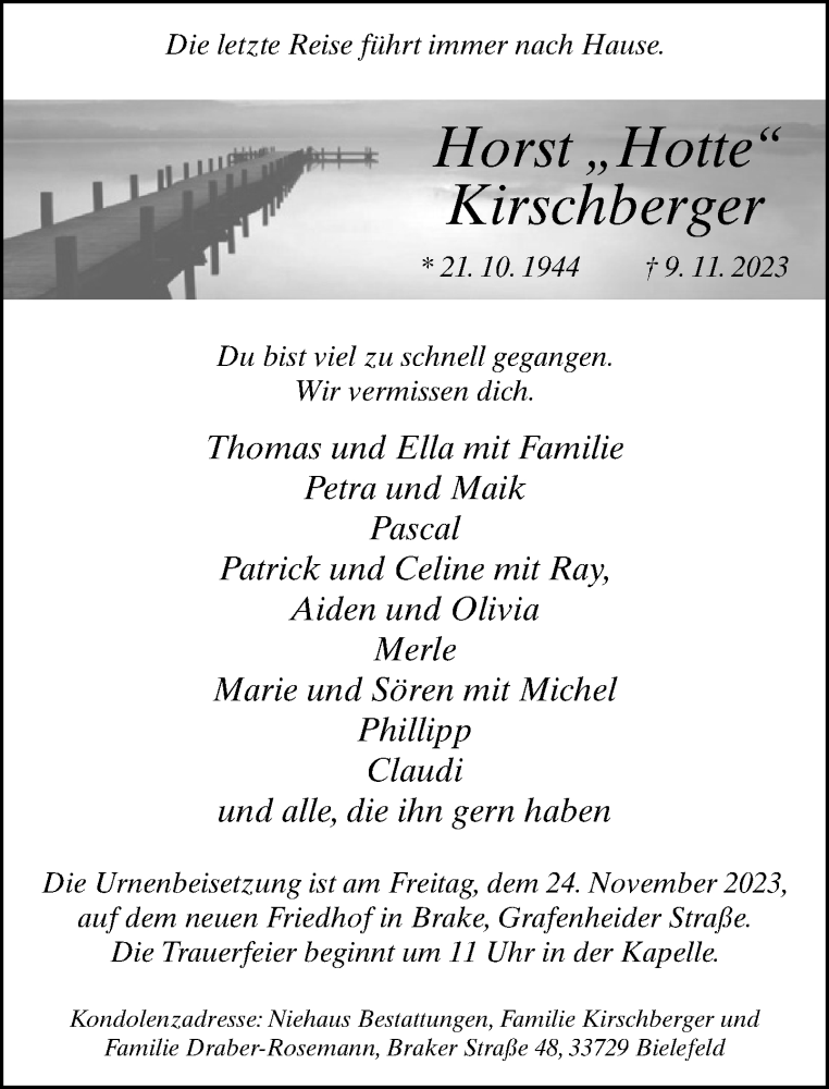 Hier finden Sie alle Traueranzeigen aus der Zeitung, die bisher für Horst Kirschberger erschienen sind. Weitere Traueranzeigen, die in der Zeitung erscheinen, werden hier ebenfalls aufgelistet