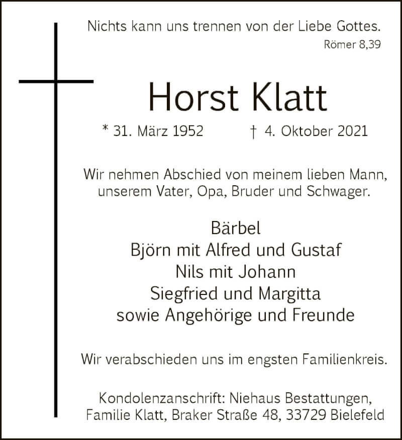 Hier finden Sie alle Traueranzeigen aus der Zeitung, die bisher für Horst Klatt erschienen sind. Weitere Traueranzeigen, die in der Zeitung erscheinen, werden hier ebenfalls aufgelistet