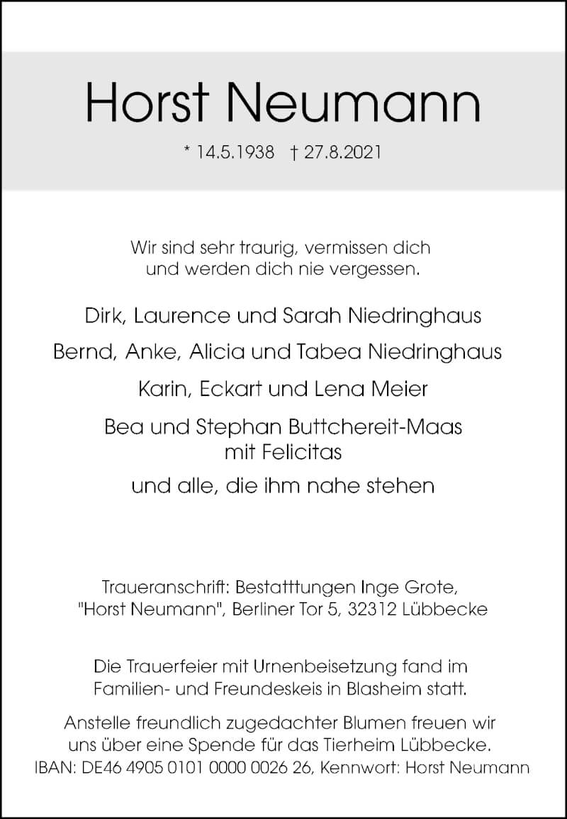 Hier finden Sie alle Traueranzeigen aus der Zeitung, die bisher für Horst Neumann erschienen sind. Weitere Traueranzeigen, die in der Zeitung erscheinen, werden hier ebenfalls aufgelistet