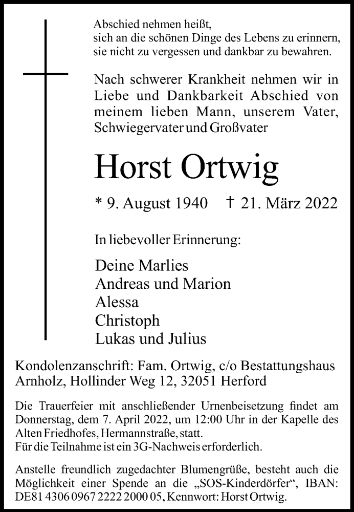 Hier finden Sie alle Traueranzeigen aus der Zeitung, die bisher für Horst Ortwig erschienen sind. Weitere Traueranzeigen, die in der Zeitung erscheinen, werden hier ebenfalls aufgelistet
