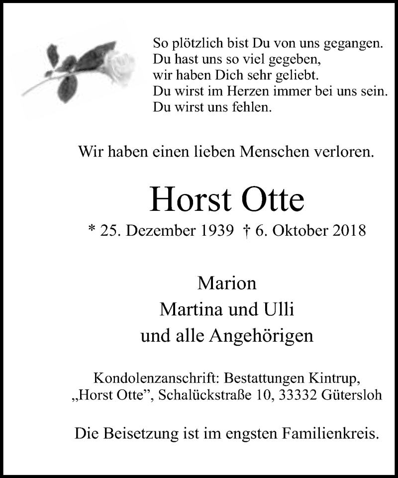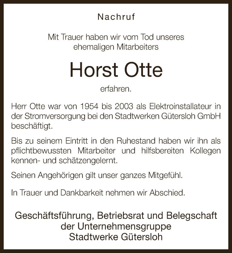 Hier finden Sie alle Traueranzeigen aus der Zeitung, die bisher für Horst Otte erschienen sind. Weitere Traueranzeigen, die in der Zeitung erscheinen, werden hier ebenfalls aufgelistet