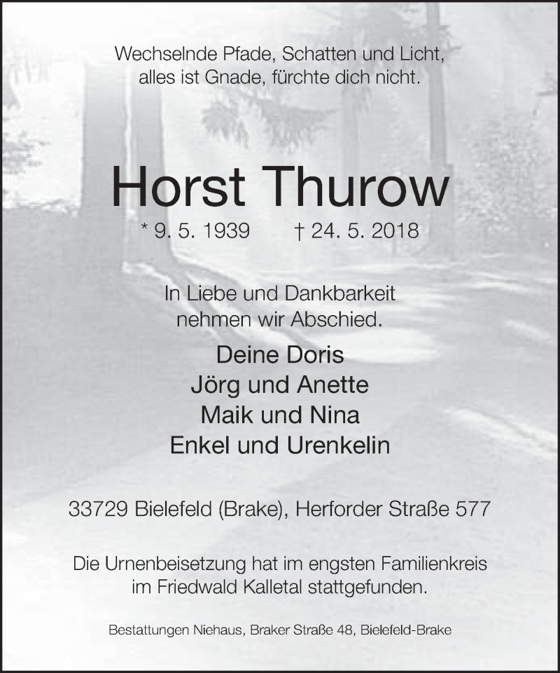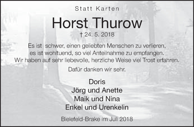 Hier finden Sie alle Traueranzeigen aus der Zeitung, die bisher für Horst Thurow erschienen sind. Weitere Traueranzeigen, die in der Zeitung erscheinen, werden hier ebenfalls aufgelistet