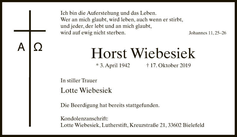Hier finden Sie alle Traueranzeigen aus der Zeitung, die bisher für Horst Wiebesiek erschienen sind. Weitere Traueranzeigen, die in der Zeitung erscheinen, werden hier ebenfalls aufgelistet