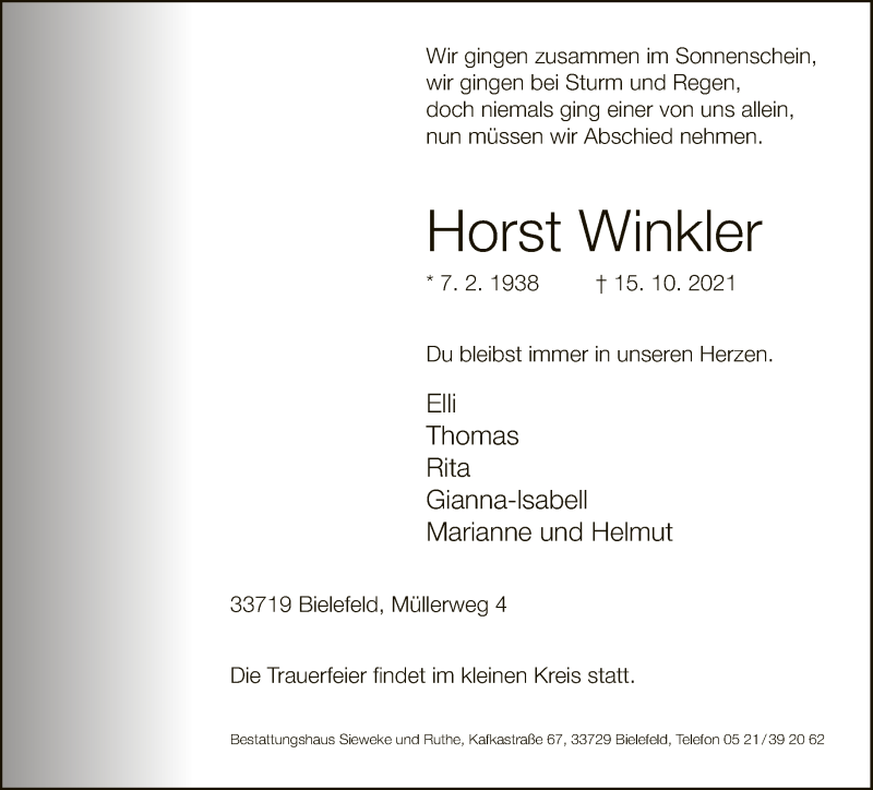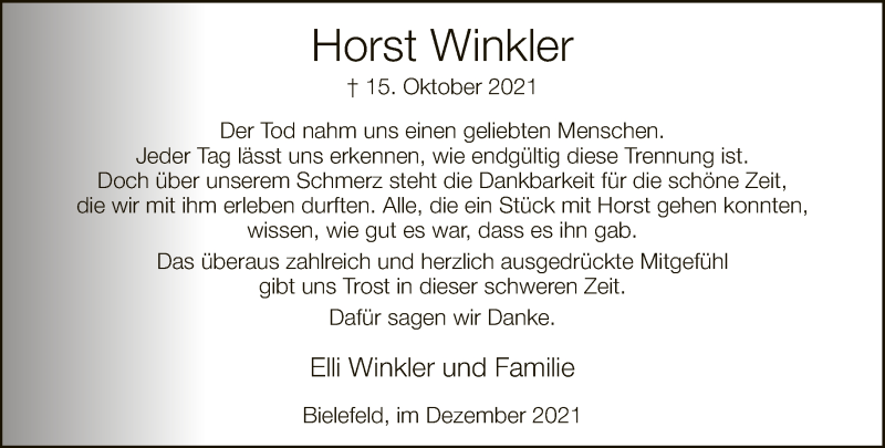 Hier finden Sie alle Traueranzeigen aus der Zeitung, die bisher für Horst Winkler erschienen sind. Weitere Traueranzeigen, die in der Zeitung erscheinen, werden hier ebenfalls aufgelistet