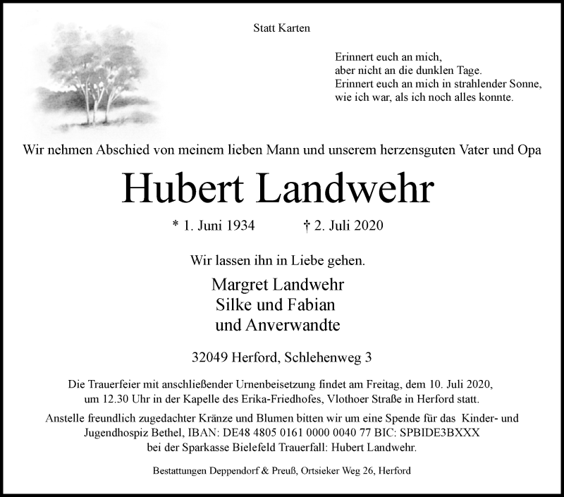 Hier finden Sie alle Traueranzeigen aus der Zeitung, die bisher für Hubert Landwehr erschienen sind. Weitere Traueranzeigen, die in der Zeitung erscheinen, werden hier ebenfalls aufgelistet