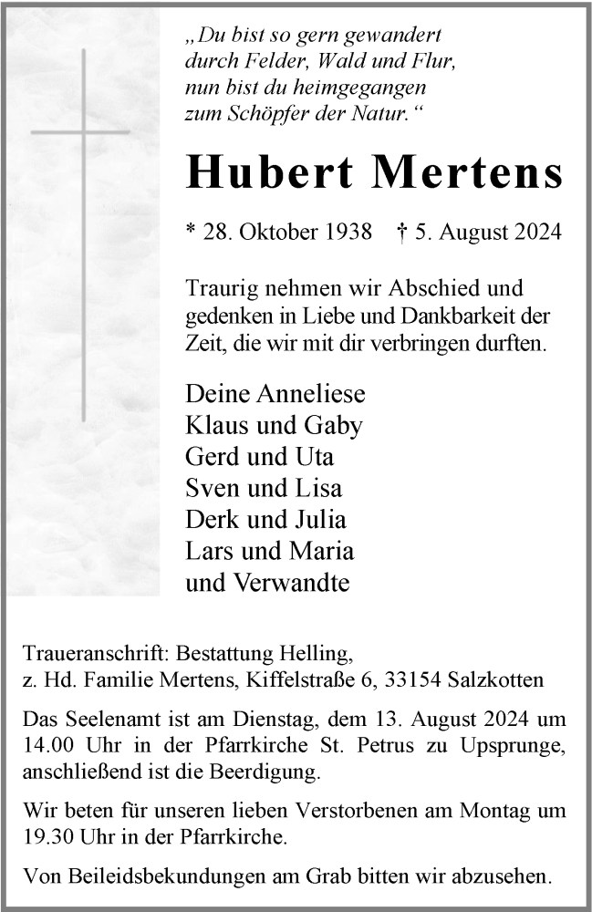 Hier finden Sie alle Traueranzeigen aus der Zeitung, die bisher für Hubert Mertens erschienen sind. Weitere Traueranzeigen, die in der Zeitung erscheinen, werden hier ebenfalls aufgelistet