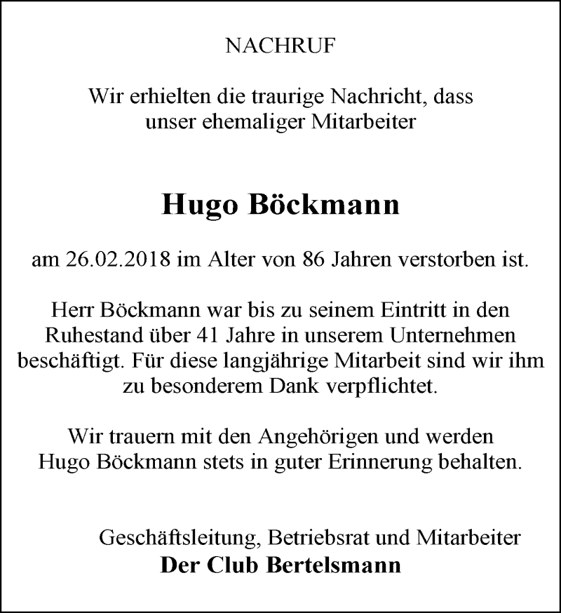 Hier finden Sie alle Traueranzeigen aus der Zeitung, die bisher für Hugo Böckmann erschienen sind. Weitere Traueranzeigen, die in der Zeitung erscheinen, werden hier ebenfalls aufgelistet
