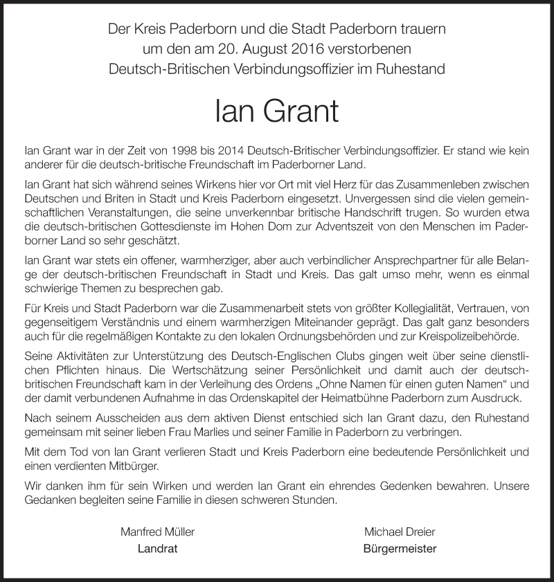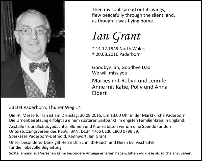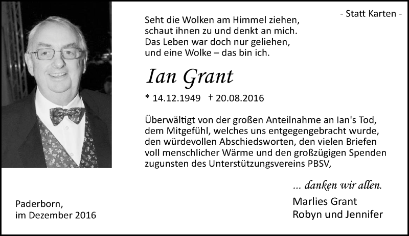 Hier finden Sie alle Traueranzeigen aus der Zeitung, die bisher für Ian Grant erschienen sind. Weitere Traueranzeigen, die in der Zeitung erscheinen, werden hier ebenfalls aufgelistet