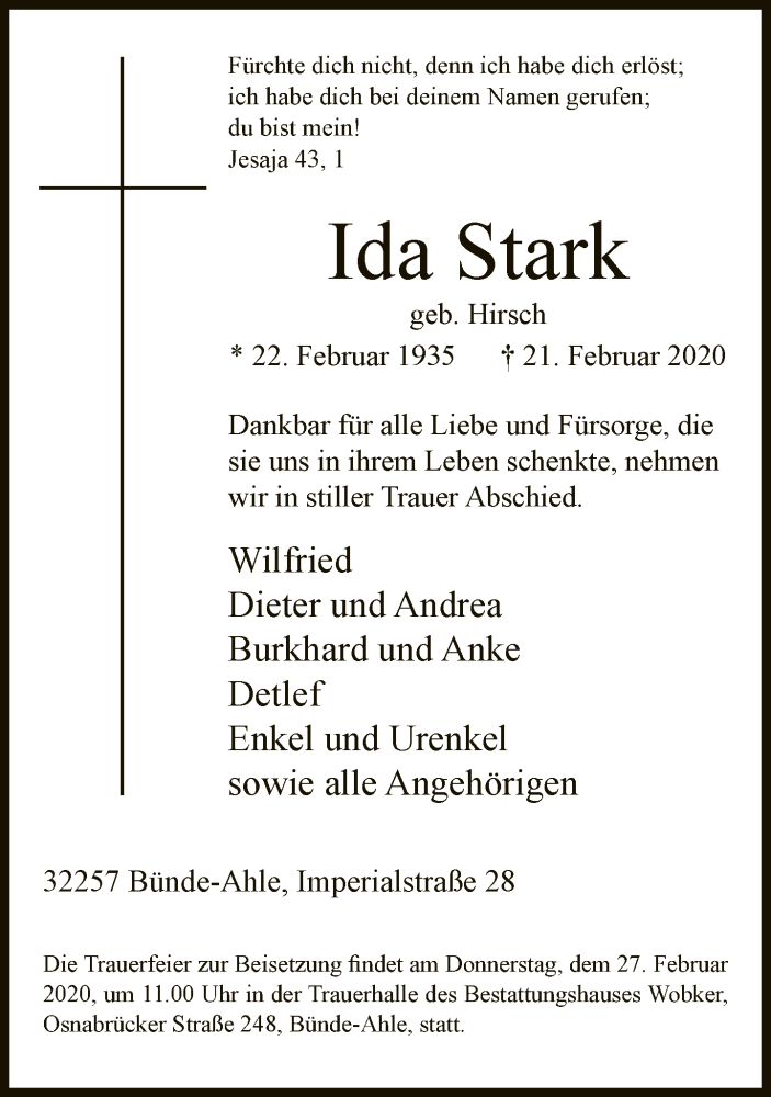 Hier finden Sie alle Traueranzeigen aus der Zeitung, die bisher für Ida Stark erschienen sind. Weitere Traueranzeigen, die in der Zeitung erscheinen, werden hier ebenfalls aufgelistet
