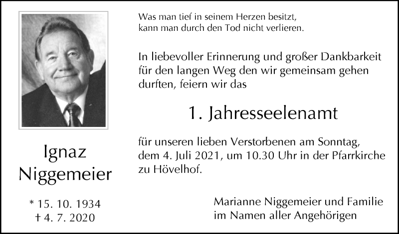 Hier finden Sie alle Traueranzeigen aus der Zeitung, die bisher für Ignaz Niggemeier erschienen sind. Weitere Traueranzeigen, die in der Zeitung erscheinen, werden hier ebenfalls aufgelistet