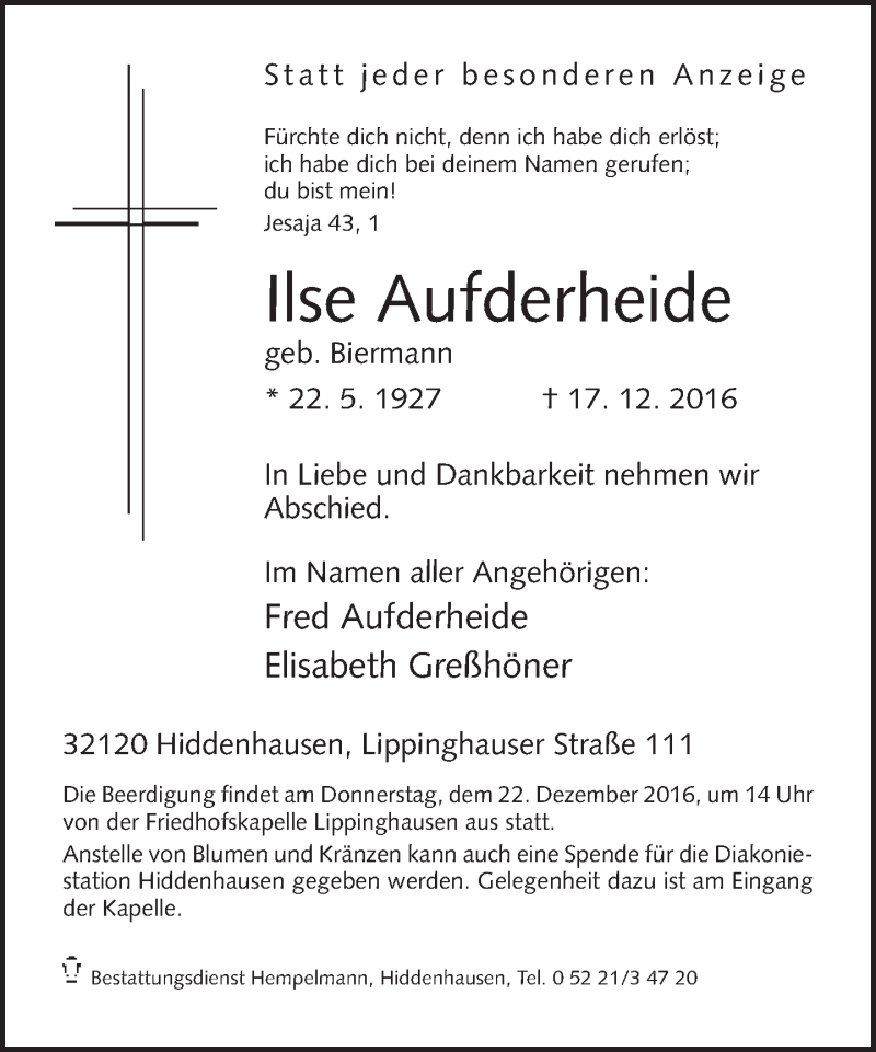 Hier finden Sie alle Traueranzeigen aus der Zeitung, die bisher für Ilse Aufderheide erschienen sind. Weitere Traueranzeigen, die in der Zeitung erscheinen, werden hier ebenfalls aufgelistet
