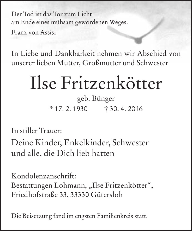 Hier finden Sie alle Traueranzeigen aus der Zeitung, die bisher für Ilse Fritzenkötter erschienen sind. Weitere Traueranzeigen, die in der Zeitung erscheinen, werden hier ebenfalls aufgelistet