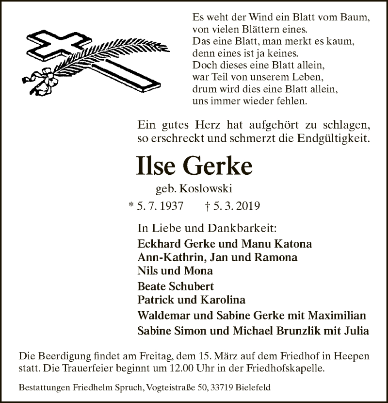 Hier finden Sie alle Traueranzeigen aus der Zeitung, die bisher für Ilse Gerke erschienen sind. Weitere Traueranzeigen, die in der Zeitung erscheinen, werden hier ebenfalls aufgelistet