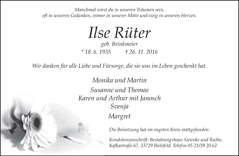 Hier finden Sie alle Traueranzeigen aus der Zeitung, die bisher für Ilse Rüter erschienen sind. Weitere Traueranzeigen, die in der Zeitung erscheinen, werden hier ebenfalls aufgelistet