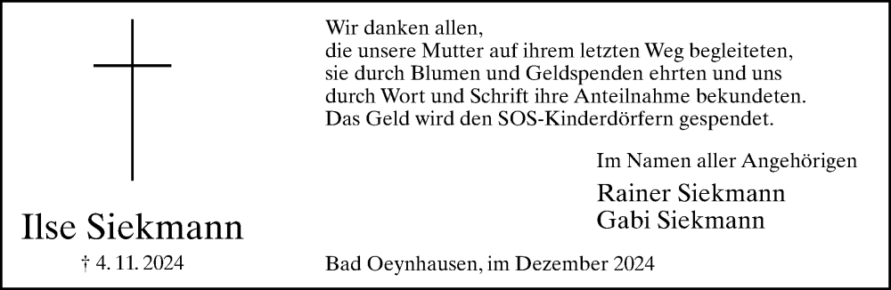 Hier finden Sie alle Traueranzeigen aus der Zeitung, die bisher für Ilse Siekmann erschienen sind. Weitere Traueranzeigen, die in der Zeitung erscheinen, werden hier ebenfalls aufgelistet