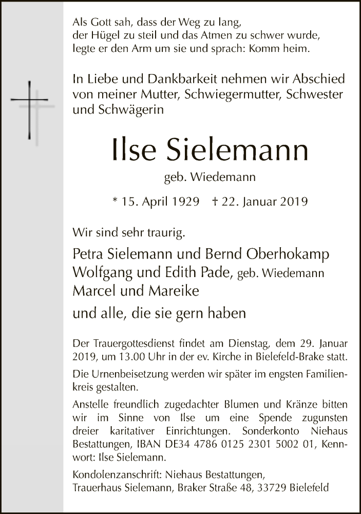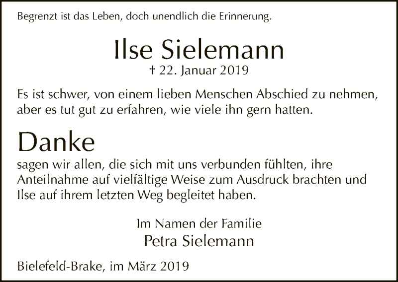 Hier finden Sie alle Traueranzeigen aus der Zeitung, die bisher für Ilse Sielemann erschienen sind. Weitere Traueranzeigen, die in der Zeitung erscheinen, werden hier ebenfalls aufgelistet