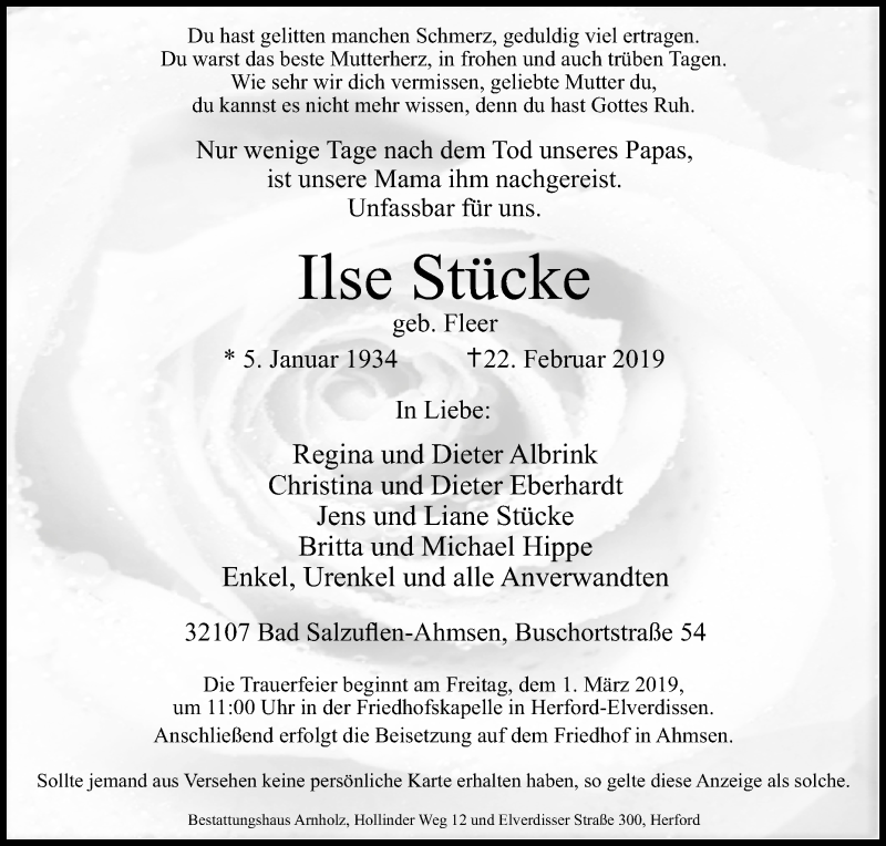 Hier finden Sie alle Traueranzeigen aus der Zeitung, die bisher für Ilse Stücke erschienen sind. Weitere Traueranzeigen, die in der Zeitung erscheinen, werden hier ebenfalls aufgelistet