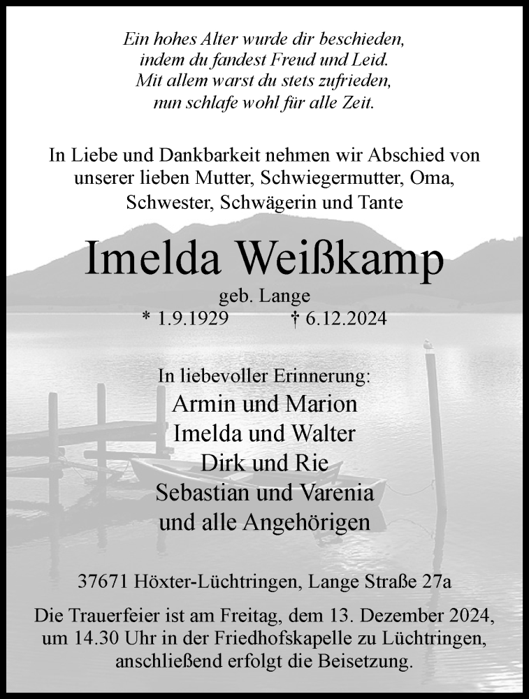 Hier finden Sie alle Traueranzeigen aus der Zeitung, die bisher für Imelda Weißkamp erschienen sind. Weitere Traueranzeigen, die in der Zeitung erscheinen, werden hier ebenfalls aufgelistet