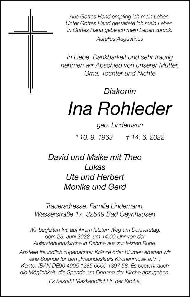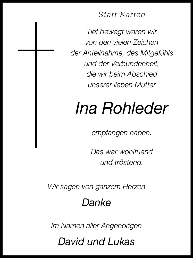 Hier finden Sie alle Traueranzeigen aus der Zeitung, die bisher für Ina Rohleder erschienen sind. Weitere Traueranzeigen, die in der Zeitung erscheinen, werden hier ebenfalls aufgelistet