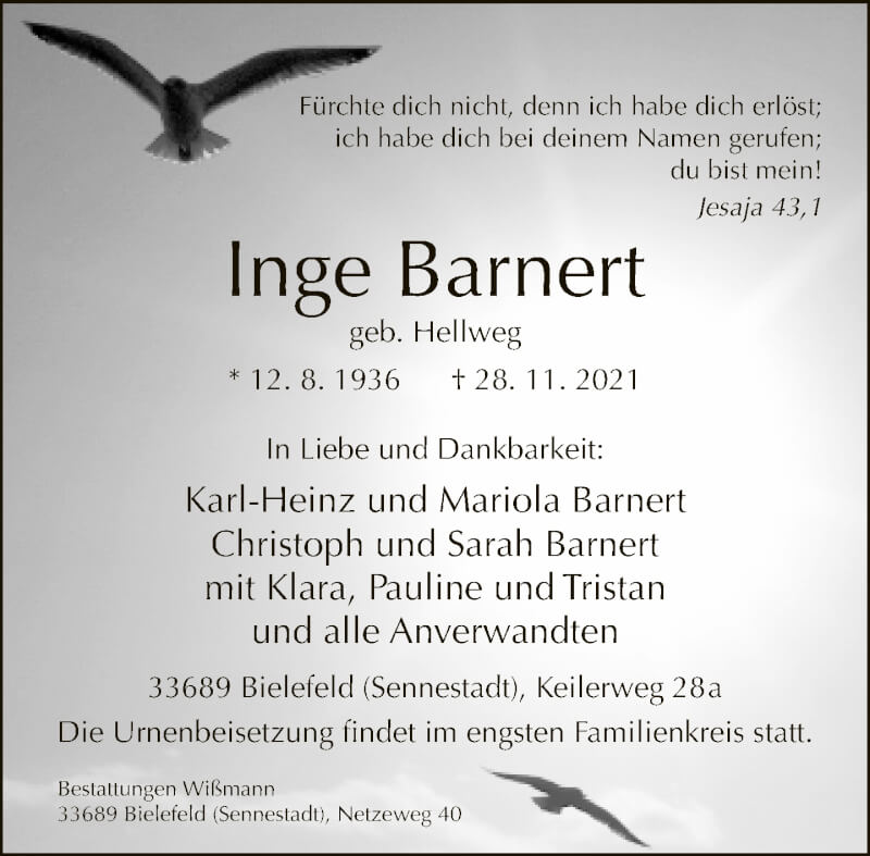 Hier finden Sie alle Traueranzeigen aus der Zeitung, die bisher für Inge Barnert erschienen sind. Weitere Traueranzeigen, die in der Zeitung erscheinen, werden hier ebenfalls aufgelistet
