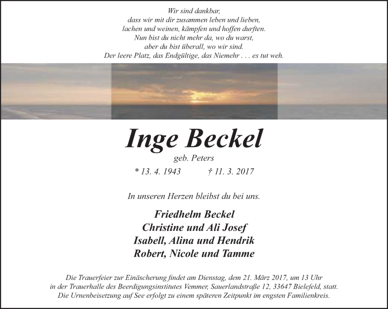 Hier finden Sie alle Traueranzeigen aus der Zeitung, die bisher für Inge Beckel erschienen sind. Weitere Traueranzeigen, die in der Zeitung erscheinen, werden hier ebenfalls aufgelistet