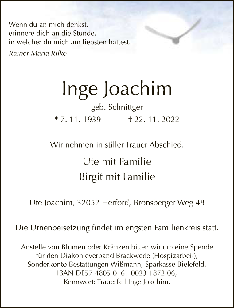 Hier finden Sie alle Traueranzeigen aus der Zeitung, die bisher für Inge Joachim erschienen sind. Weitere Traueranzeigen, die in der Zeitung erscheinen, werden hier ebenfalls aufgelistet