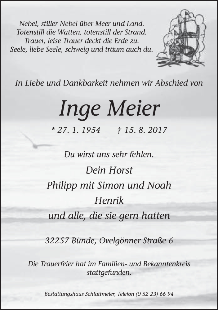 Hier finden Sie alle Traueranzeigen aus der Zeitung, die bisher für Inge Meier erschienen sind. Weitere Traueranzeigen, die in der Zeitung erscheinen, werden hier ebenfalls aufgelistet