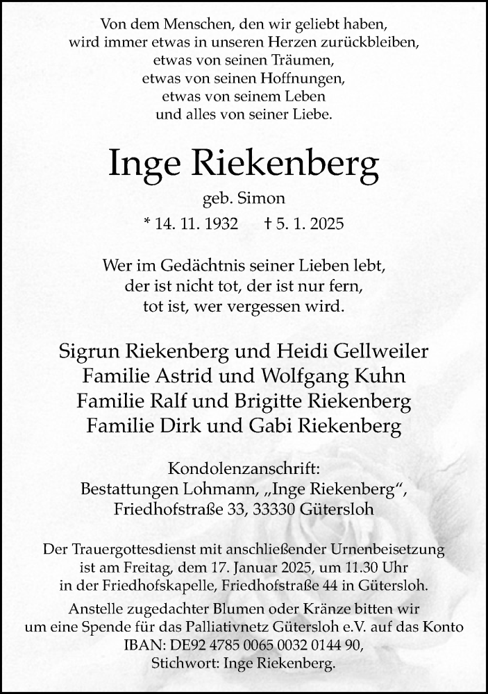 Hier finden Sie alle Traueranzeigen aus der Zeitung, die bisher für Inge Riekenberg erschienen sind. Weitere Traueranzeigen, die in der Zeitung erscheinen, werden hier ebenfalls aufgelistet