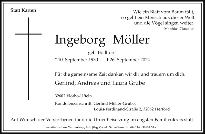 Hier finden Sie alle Traueranzeigen aus der Zeitung, die bisher für Ingeborg Möller erschienen sind. Weitere Traueranzeigen, die in der Zeitung erscheinen, werden hier ebenfalls aufgelistet