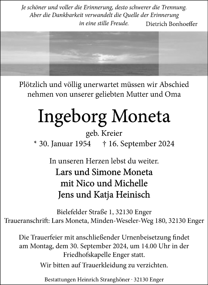 Hier finden Sie alle Traueranzeigen aus der Zeitung, die bisher für Ingeborg Moneta erschienen sind. Weitere Traueranzeigen, die in der Zeitung erscheinen, werden hier ebenfalls aufgelistet
