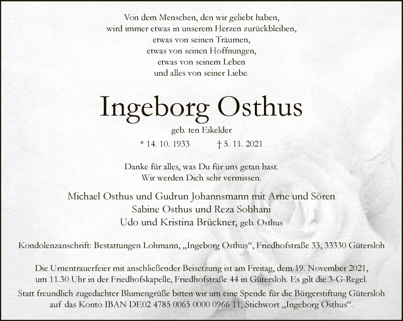 Hier finden Sie alle Traueranzeigen aus der Zeitung, die bisher für Ingeborg Osthus erschienen sind. Weitere Traueranzeigen, die in der Zeitung erscheinen, werden hier ebenfalls aufgelistet