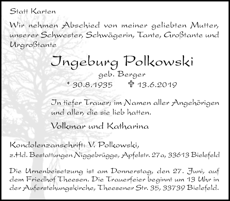 Hier finden Sie alle Traueranzeigen aus der Zeitung, die bisher für Ingeburg Polkowski erschienen sind. Weitere Traueranzeigen, die in der Zeitung erscheinen, werden hier ebenfalls aufgelistet