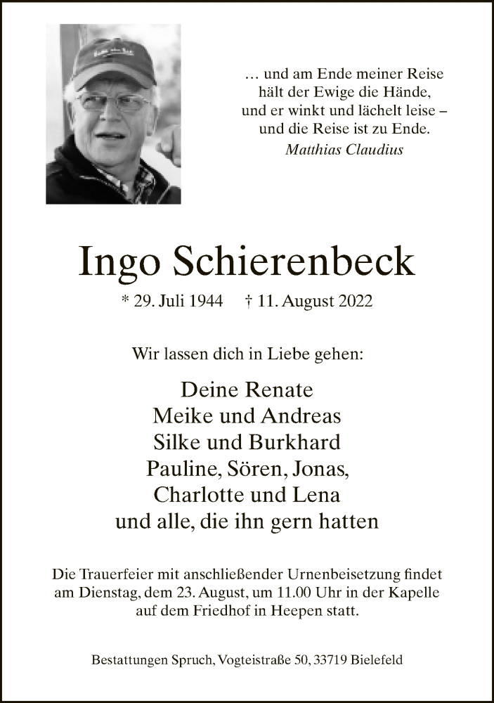 Hier finden Sie alle Traueranzeigen aus der Zeitung, die bisher für Ingo Schierenbeck erschienen sind. Weitere Traueranzeigen, die in der Zeitung erscheinen, werden hier ebenfalls aufgelistet