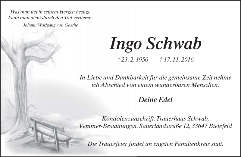 Hier finden Sie alle Traueranzeigen aus der Zeitung, die bisher für Ingo Schwab erschienen sind. Weitere Traueranzeigen, die in der Zeitung erscheinen, werden hier ebenfalls aufgelistet