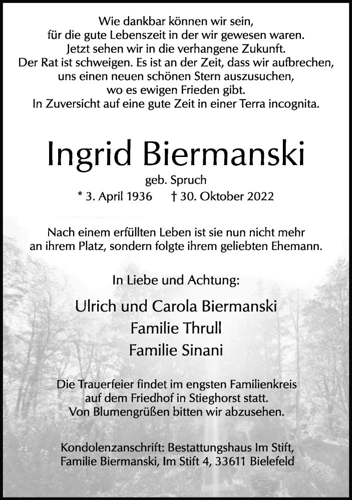 Hier finden Sie alle Traueranzeigen aus der Zeitung, die bisher für Ingrid Biermanski erschienen sind. Weitere Traueranzeigen, die in der Zeitung erscheinen, werden hier ebenfalls aufgelistet