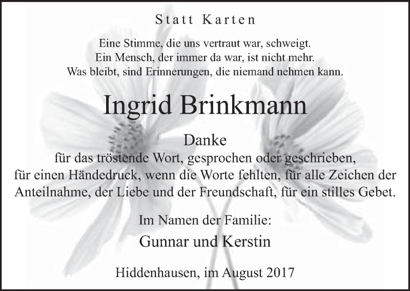 Hier finden Sie alle Traueranzeigen aus der Zeitung, die bisher für Ingrid Brinkmann erschienen sind. Weitere Traueranzeigen, die in der Zeitung erscheinen, werden hier ebenfalls aufgelistet