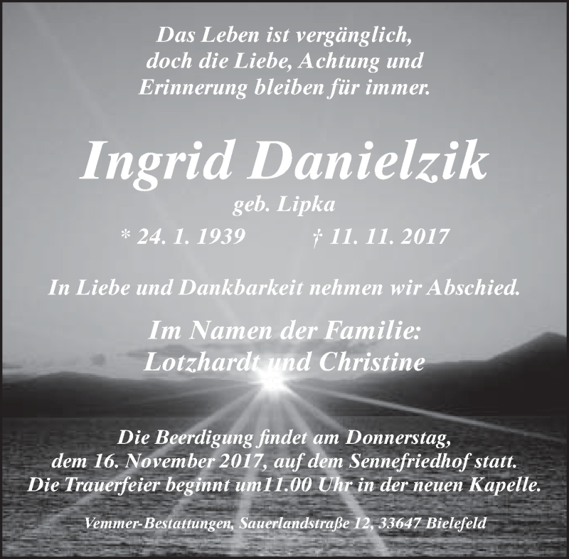 Hier finden Sie alle Traueranzeigen aus der Zeitung, die bisher für Ingrid Danielzik erschienen sind. Weitere Traueranzeigen, die in der Zeitung erscheinen, werden hier ebenfalls aufgelistet