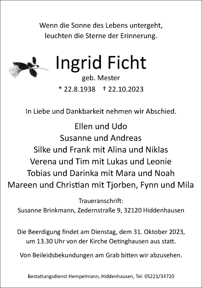 Hier finden Sie alle Traueranzeigen aus der Zeitung, die bisher für Ingrid Ficht erschienen sind. Weitere Traueranzeigen, die in der Zeitung erscheinen, werden hier ebenfalls aufgelistet