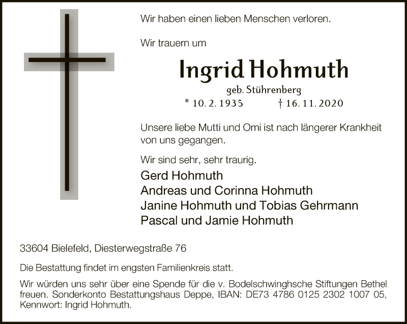 Hier finden Sie alle Traueranzeigen aus der Zeitung, die bisher für Ingrid Hohmuth erschienen sind. Weitere Traueranzeigen, die in der Zeitung erscheinen, werden hier ebenfalls aufgelistet