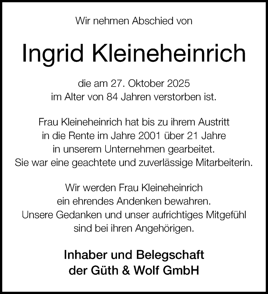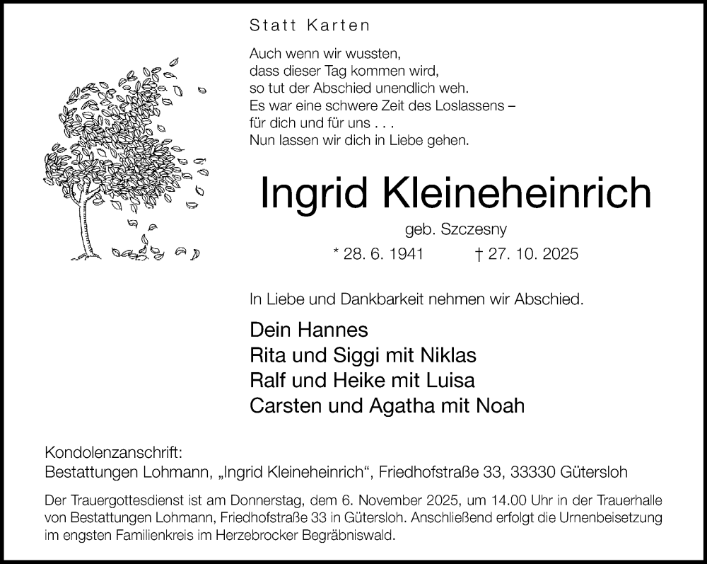 Hier finden Sie alle Traueranzeigen aus der Zeitung, die bisher für Ingrid Kleineheinrich erschienen sind. Weitere Traueranzeigen, die in der Zeitung erscheinen, werden hier ebenfalls aufgelistet