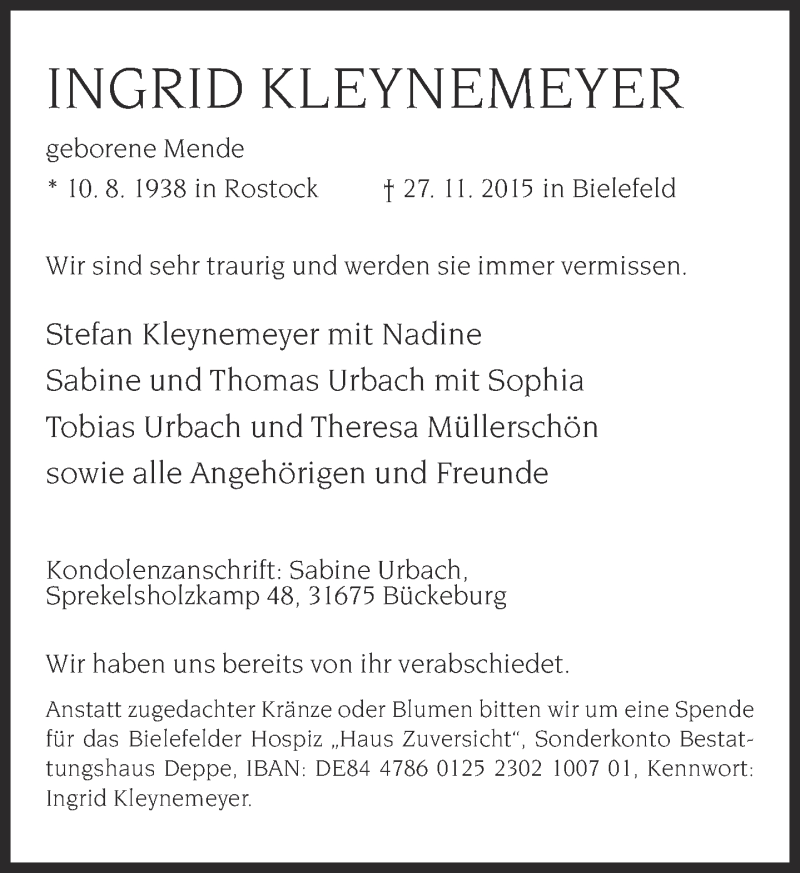 Hier finden Sie alle Traueranzeigen aus der Zeitung, die bisher für Ingrid Kleynemeyer erschienen sind. Weitere Traueranzeigen, die in der Zeitung erscheinen, werden hier ebenfalls aufgelistet