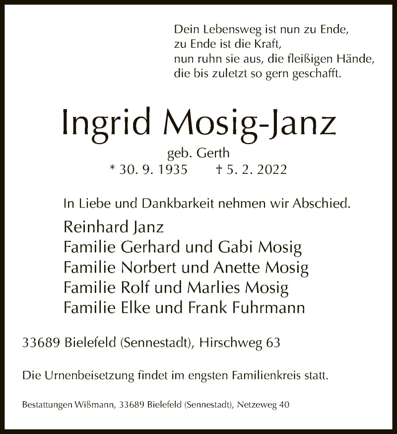 Hier finden Sie alle Traueranzeigen aus der Zeitung, die bisher für Ingrid Mosig-Janz erschienen sind. Weitere Traueranzeigen, die in der Zeitung erscheinen, werden hier ebenfalls aufgelistet