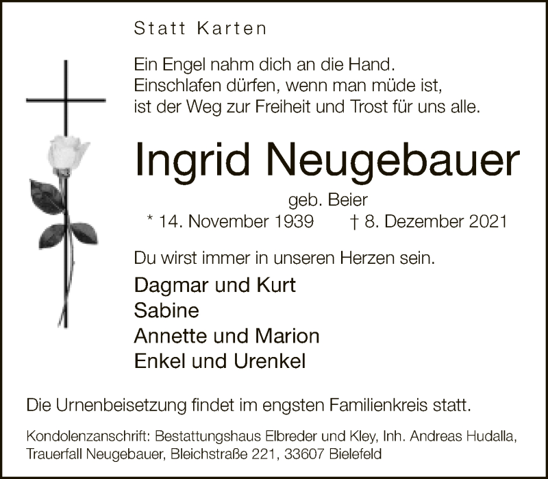 Hier finden Sie alle Traueranzeigen aus der Zeitung, die bisher für Ingrid Neugebauer erschienen sind. Weitere Traueranzeigen, die in der Zeitung erscheinen, werden hier ebenfalls aufgelistet