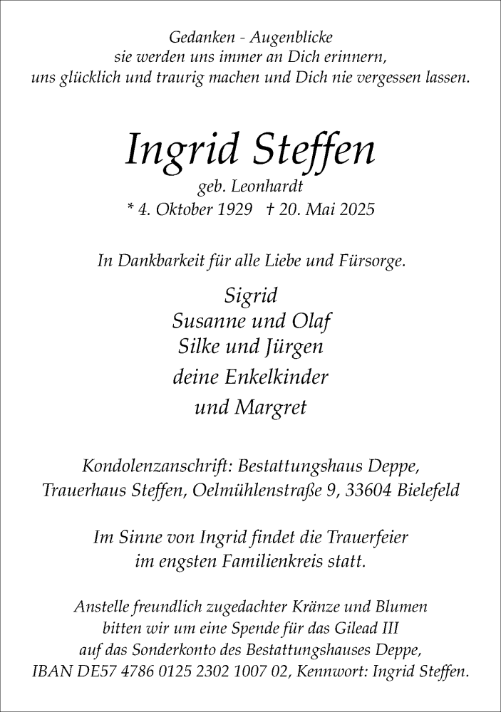 Hier finden Sie alle Traueranzeigen aus der Zeitung, die bisher für Ingrid Steffen erschienen sind. Weitere Traueranzeigen, die in der Zeitung erscheinen, werden hier ebenfalls aufgelistet
