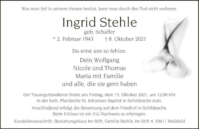 Hier finden Sie alle Traueranzeigen aus der Zeitung, die bisher für Ingrid Stehle erschienen sind. Weitere Traueranzeigen, die in der Zeitung erscheinen, werden hier ebenfalls aufgelistet