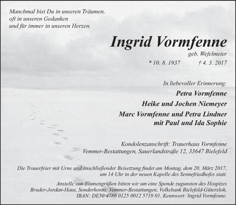 Hier finden Sie alle Traueranzeigen aus der Zeitung, die bisher für Ingrid Vormfenne erschienen sind. Weitere Traueranzeigen, die in der Zeitung erscheinen, werden hier ebenfalls aufgelistet