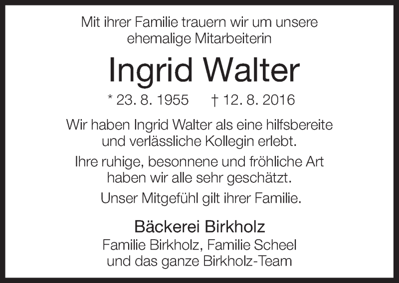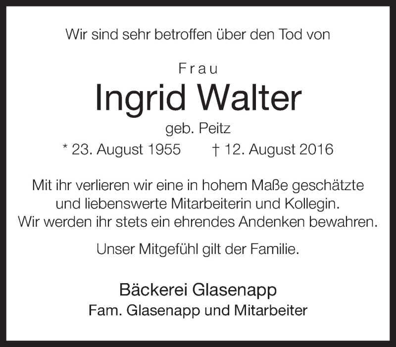 Hier finden Sie alle Traueranzeigen aus der Zeitung, die bisher für Ingrid Walter erschienen sind. Weitere Traueranzeigen, die in der Zeitung erscheinen, werden hier ebenfalls aufgelistet